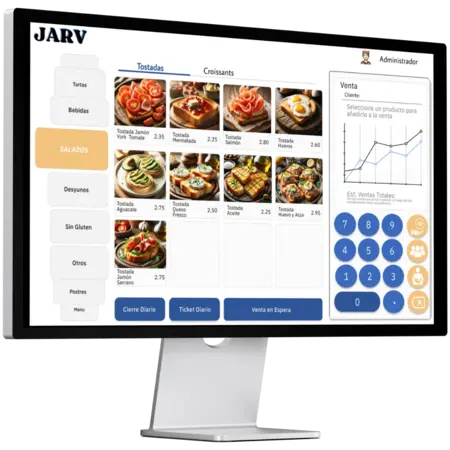 JARV es un software TPV fácil para hostelería ligera y comercios sin cocina: cafeterías, panaderías, pastelerías, heladerías, peluquerías y estudios de tatuajes. Te ayuda a cobrar rápido, controlar inventario y mermas y ver informes de ventas en tiempo real. Ideal si buscas un TPV simple y completo, que tu equipo aprenda en minutos.