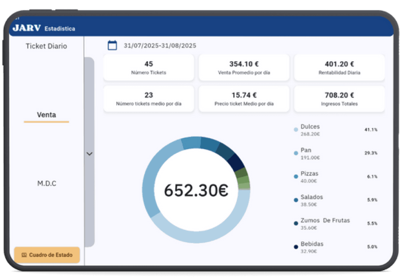El sistema TPV para hostelería también facilita el control de productos, la gestión de ventas y el seguimiento de la actividad del establecimiento. Gracias a su diseño intuitivo, el software de cafetería JARV permite que el personal trabaje de forma más rápida y eficiente.