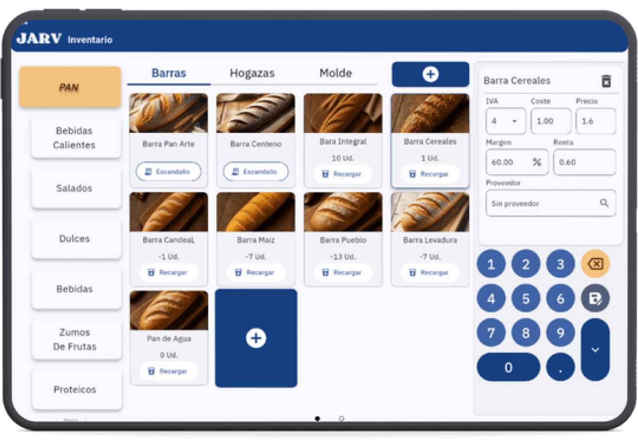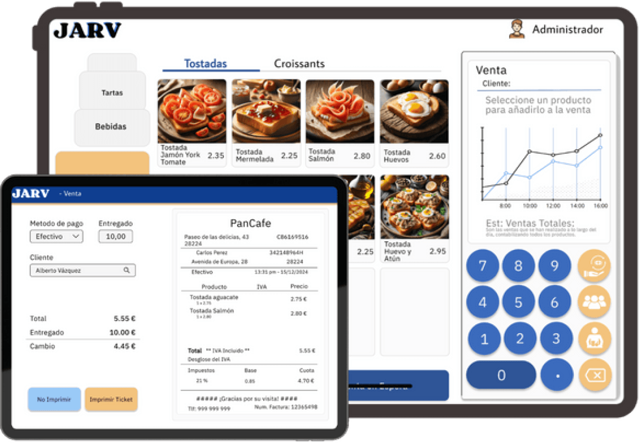 JARV es un software TPV diseñado para facilitar la gestión diaria de cafeterías, panaderías, pastelerías y pequeños negocios de hostelería. Este sistema de punto de venta permite controlar de forma sencilla las ventas, los pedidos, la caja y el catálogo de productos desde una interfaz clara y fácil de usar.